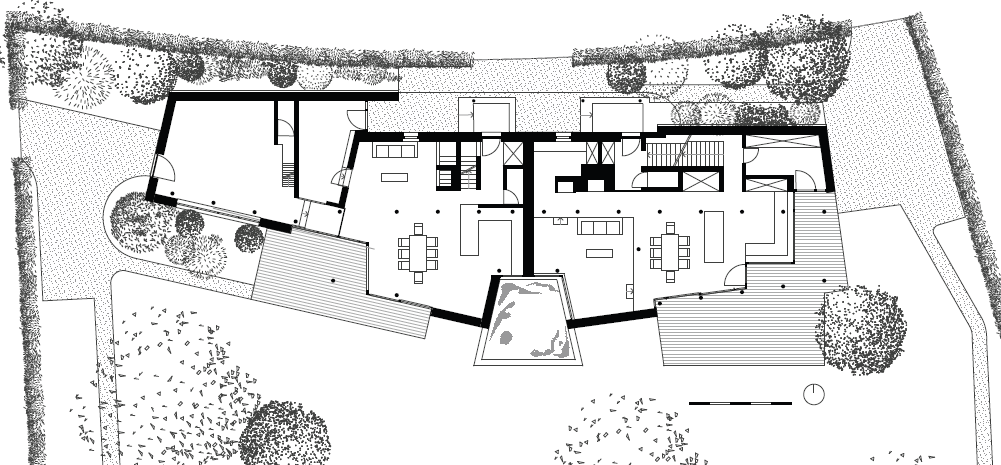 Les deux habitations se glissent sous une coque protectrice en bardeaux de bois. La construction apparaît comme un volume unique, discret et refermé, sur la rue et le nord. Côté sud au contraire, les deux maisons s’ouvrent en direction du jardin arboré et s’écartent en leur centre, de part et d’autre d’un bassin. Celui-ci les relie, tout en assurant la distinction et l’intimité́ des deux foyers.