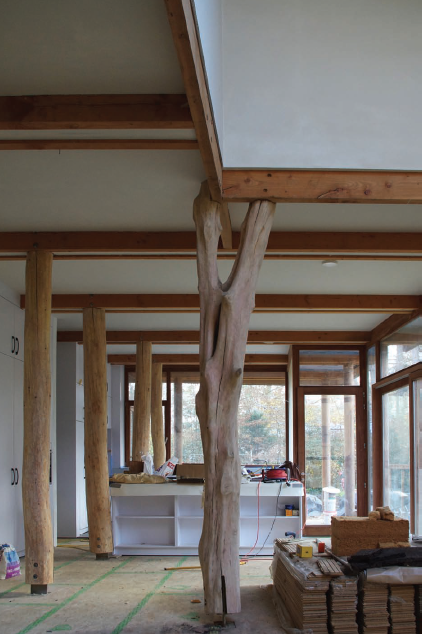 À l’intérieur, les troncs sculpturaux, les ombres projetées des arbres du jardin et les reflets de la lumière sur l’eau du bassin donnent la sensation d’habiter au cœur d’une forêt.